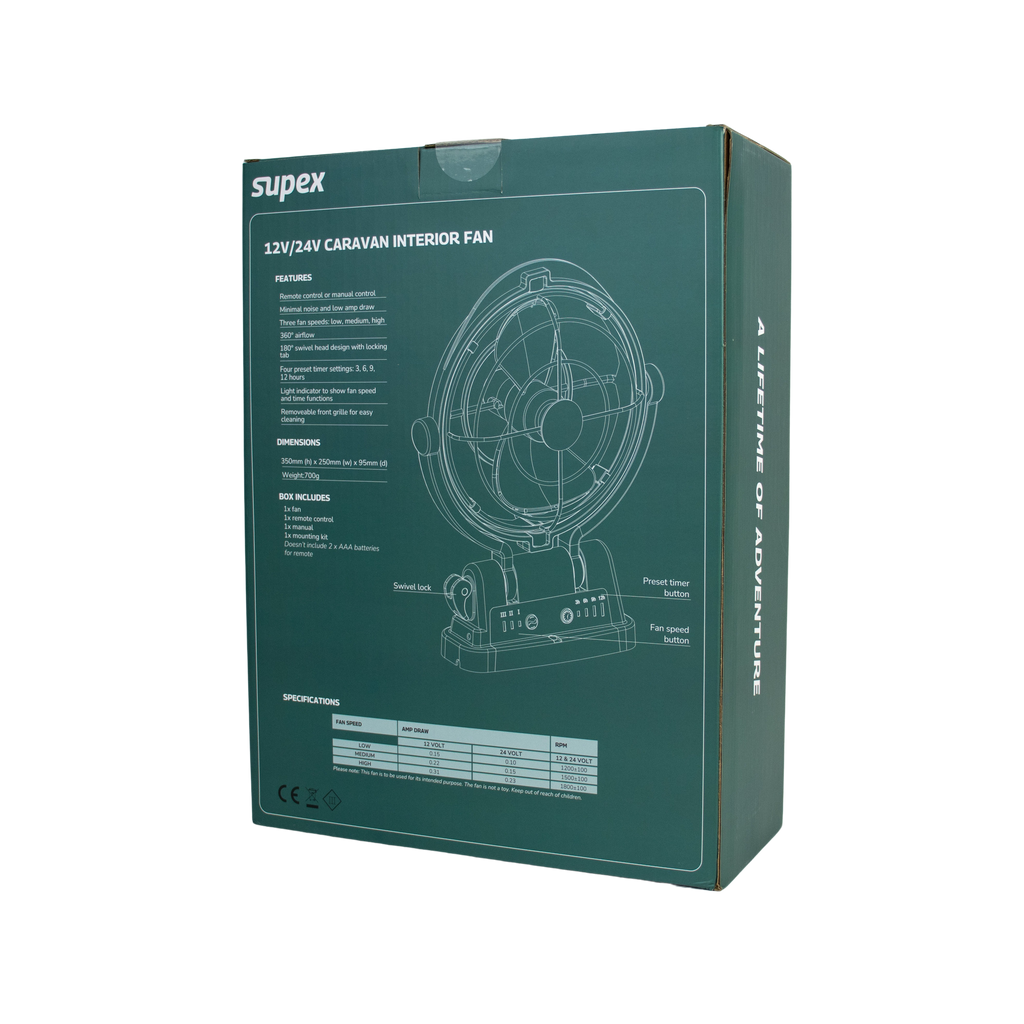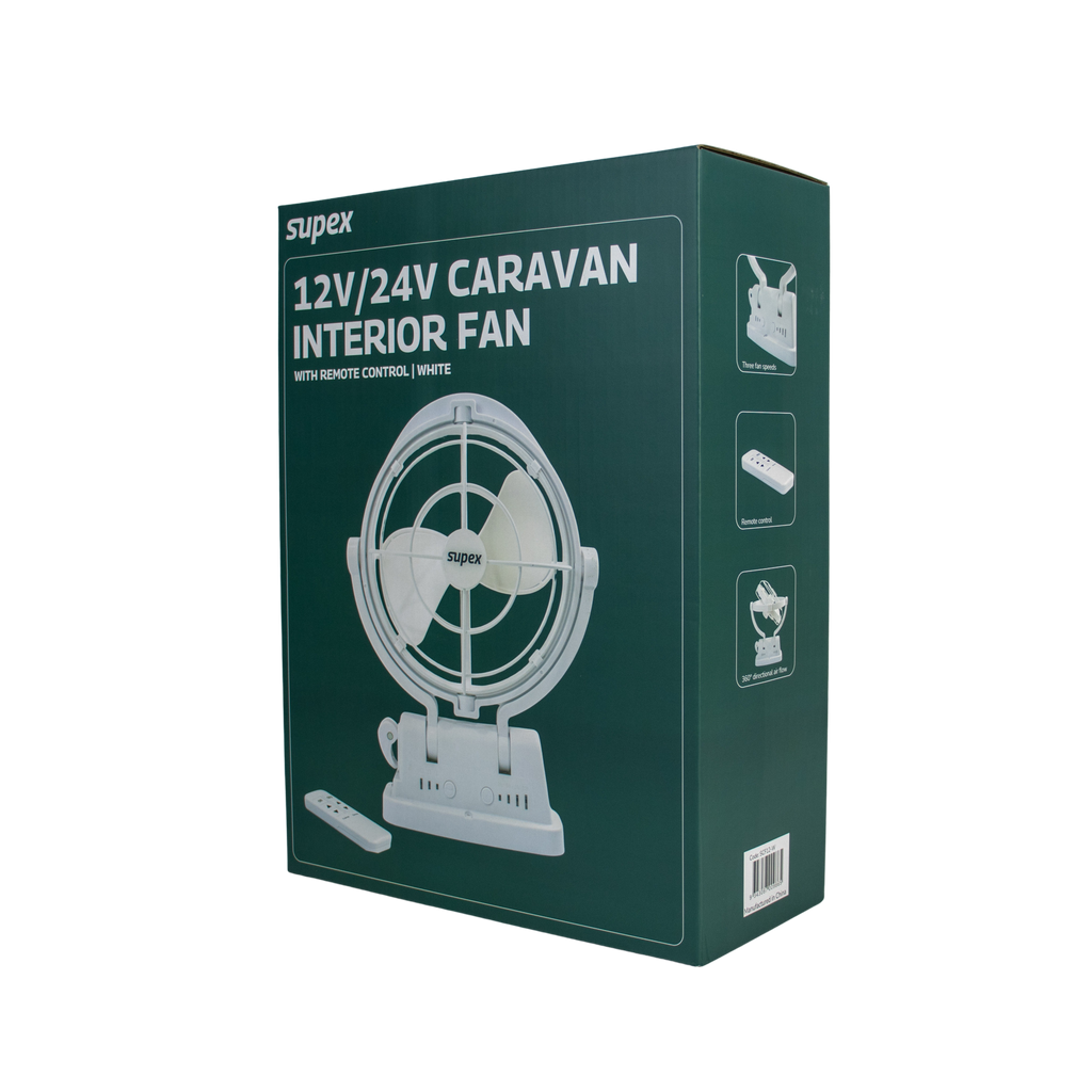 Upgrade your caravan’s comfort with this white 12V/24V caravan fan, designed for quiet, energy-efficient airflow. Featuring remote control and manual operation, this low-noise fan offers three adjustable speeds (low, medium, high) and a 360° airflow system for optimal ventilation. The 12v/24v caravan fan has a 180° swivel head with a locking tab allows you to direct airflow where you need it most, while the four preset timer settings (3, 6, 9, 12 hours) ensure convenience and energy savings. A light indicator displays fan speed and timer functions, and the removable front grille makes cleaning effortless. This 12v/24v caravan fan is perfect for caravans, RVs, and motorhomes, this low-amp-draw fan keeps your space cool and comfortable on the road.
