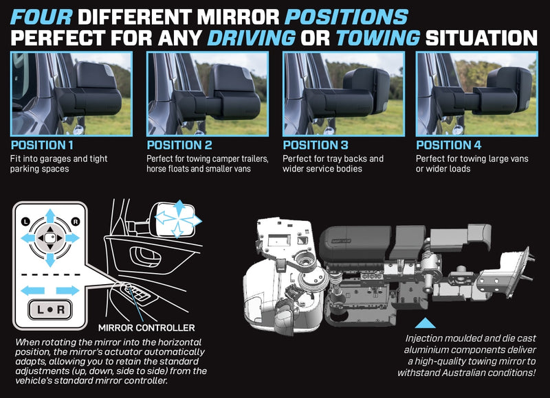 The large single mirror lens creates less confusion and enhanced safety while driving. The four, easily adjustable positions, provide greater vision, with less vibration to any towing situation, while maintaining ADR compliance and safety. When the mirror is rotated into the horizontal position, the mirror’s actuator automatically adapts, allowing for standard adjustments (up, down, side to side) from the vehicle’s standard mirror controller. This caters to drivers of differing height and seated positions. Designed to fold inwards or outwards when bumped in car parks, or when contact is made with trees and other obstacles around the vehicle. Simple to fit. MSA 4X4’s Towing Mirrors mount onto a vehicle door in the same position as the existing mirrors. Most factory mirror functions are retained and come with the choice of black or chrome.The MSA 4X4 patented Towing Mirrors are manufactured extremely tough.Injection moulded and die cast aluminium components deliver a high-quality towing mirror to withstand Australian conditions. A great all-around mirror for towing caravans, camper trailers, trailers, boats and horse floats. Available to suit a growing range of towing vehicles.