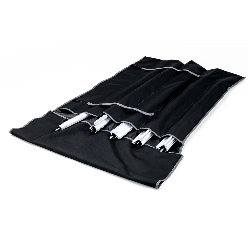 This storage bag features 6 pockets, carry handle and easy to use Velcro strap to secure the bag neatly together. Made from durable, lightweight polyester fabric and finished in a sleek black and grey design, our storage bag fits a complete Anti-Flap Kit plus 1-4 Curved Roof Rafters.