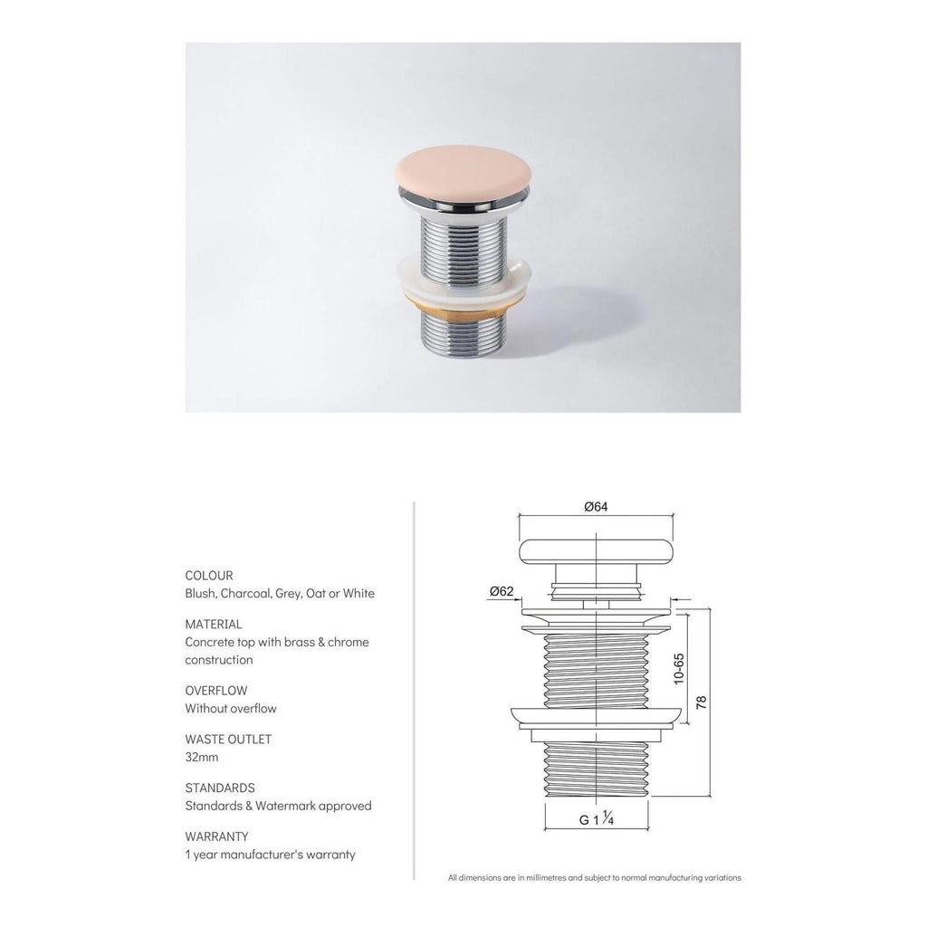 Concrete top pop-up waste with brass & chrome construction.