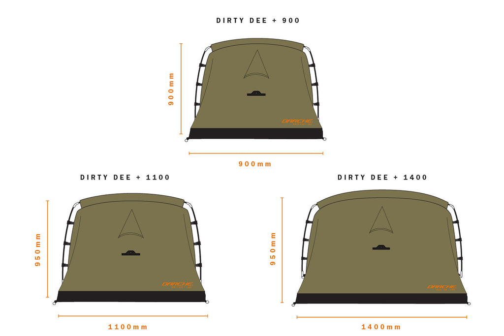The DARCHE Dirty Dee Plus+ Swag including built in Hutch® is available in 3 sizes: 900, 1100 and 1400.