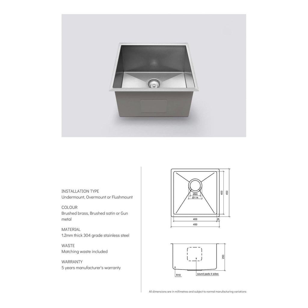 Henley Single Bowl Sink Basin 450 x 450 x 250 - Stainless Steel Brushed Satin