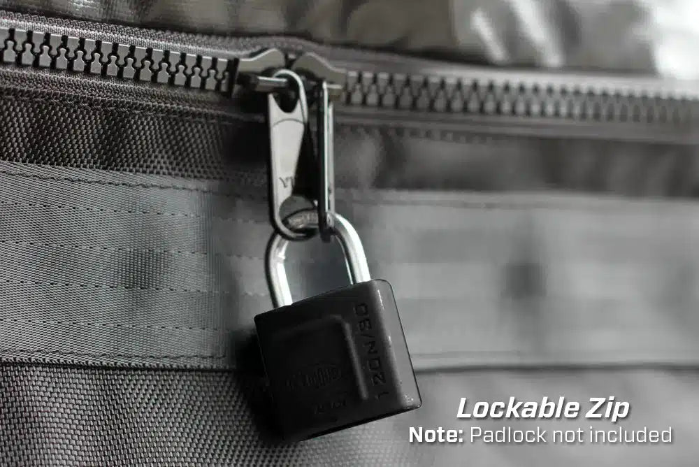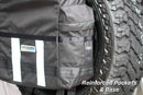 convenient carry handle, simply unclip the bag and take it anywhere. Reinforced zippered pockets on each side provide more storage for those smaller straps, ropes and shackles. The front reflective strips enhance visibility at night. A stainless steel drainage eyelet allows for the release of any fluids. Can be padlocked onto the wheel with a lock strap and together with the YKK Chunky zip with 2 x lockable metal sliders, create an extra level of security. The triple, reinforced base ensures stored gear remains secure and packed away while travelling on rough roads.